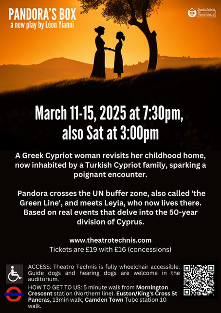 Pandora's Box, a new play by Léon Yianni, is based on real events that delve into the 50-year division of Cyprus. It follows Pandora, Greek Cypriot woman, who crosses the border to revisit her childhood home and meets Leyla, a young Turkish Cypriot woman who now lives there, leading to an emotional encounter.